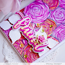 I adore this new background stamp from Whimsy Stamps called, Spiral Roses. I used Zig Clean Color markers to give it a vibrant pink and orange color.